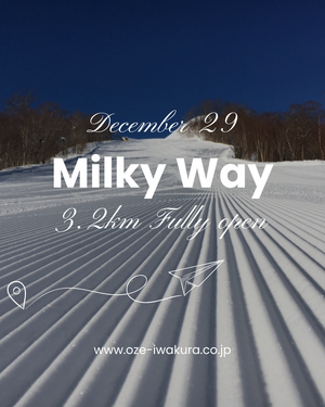明日12/29よりミルキーウェイを全線オープンします。 これにより山頂から山麓までの全長3.2キロのロングランが可能になります! 計9コース総滑走距離9,930m!!! ぜひお楽しみください。 その他コースも積雪状況が整いましたら順次オープンいたします。今しばらくお待ちくださいませ。 ミルキーウェイ【中級者コース】 全長:2,800m 最大斜度:18° 注) 中間より下部は積雪の薄い箇所がございます。滑走には充分ご注意のうえお楽しみ頂きますようお願い致します。